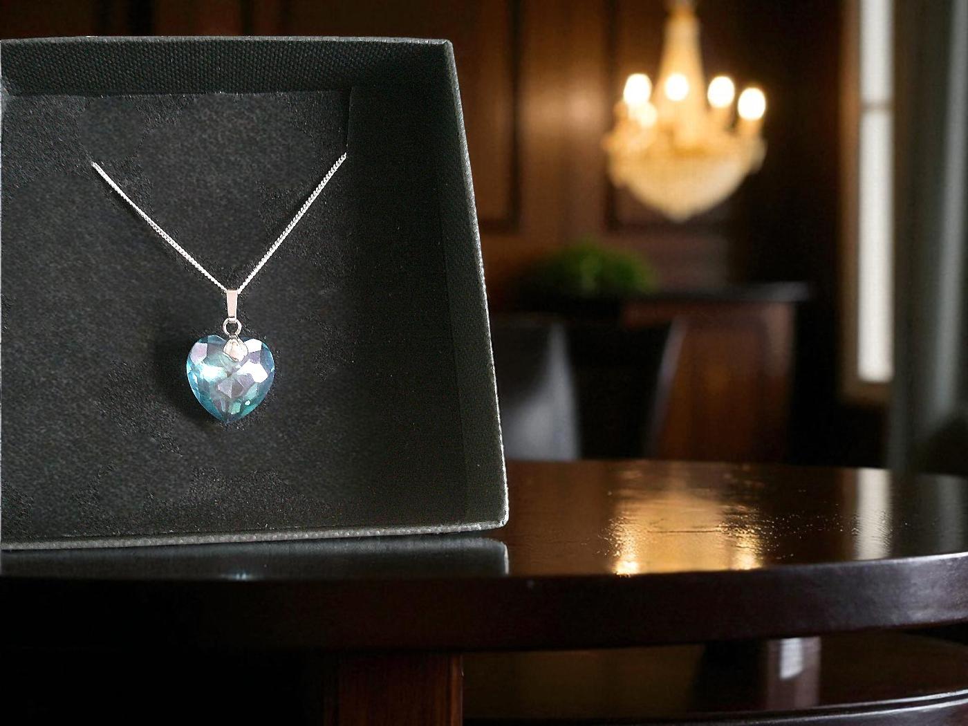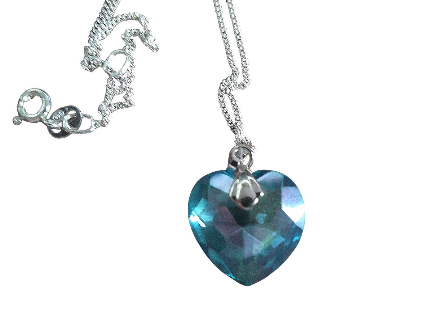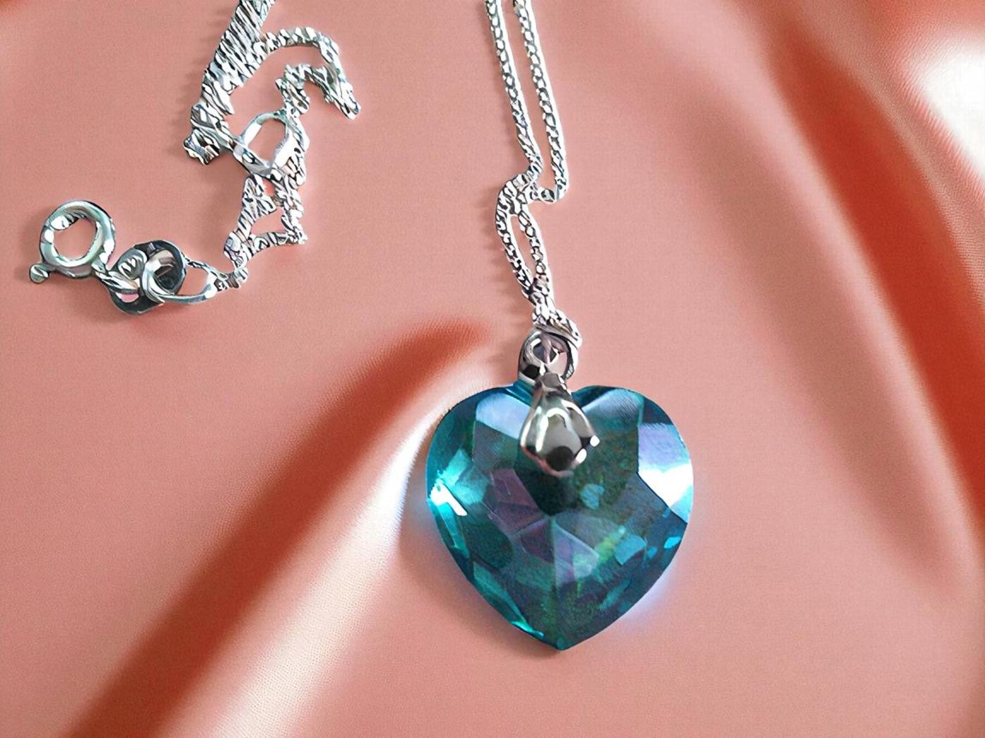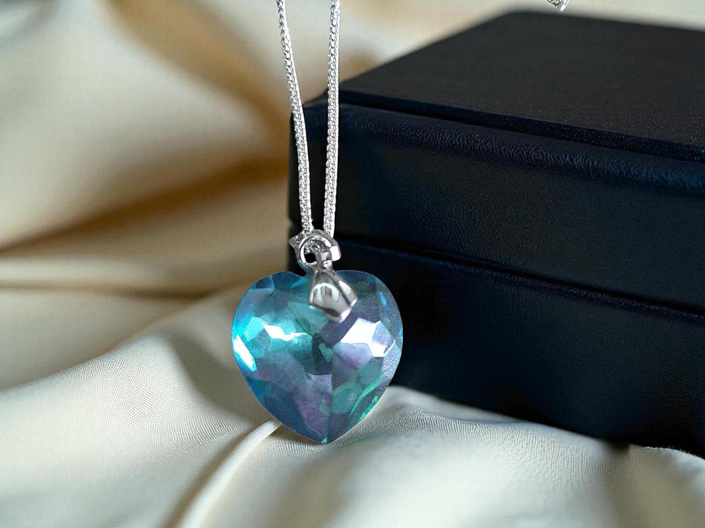 Radiating a mesmerizing blue luster, this Aqua Aura heart pendant necklace symbolizes peace, spiritual connection, and emotional clarity. with a sterling Silver18 inch chain