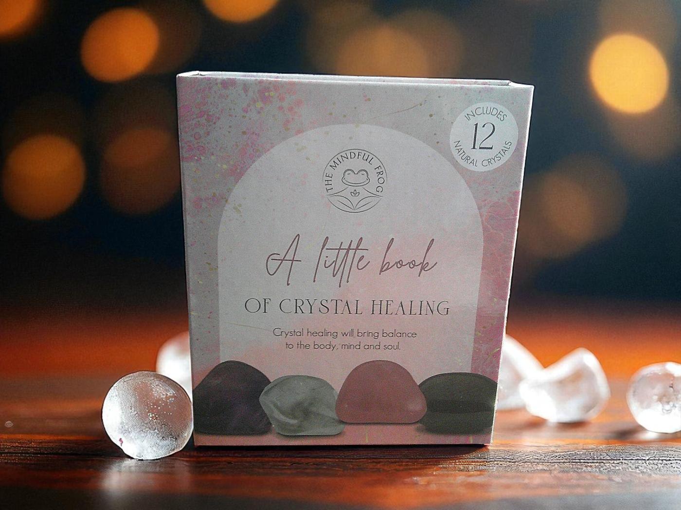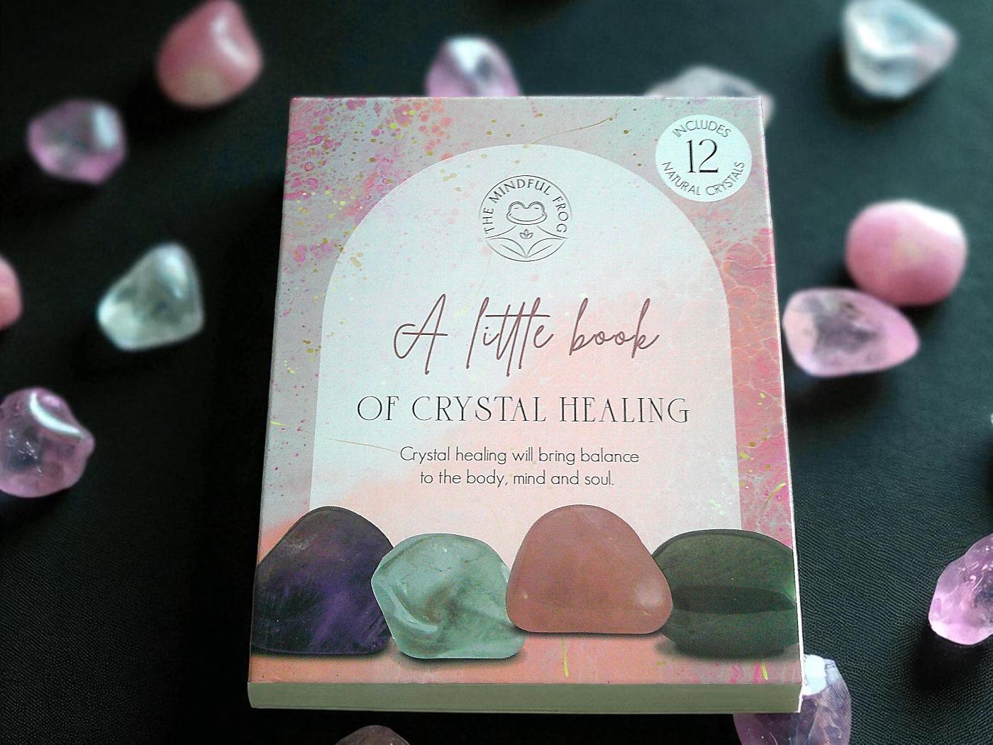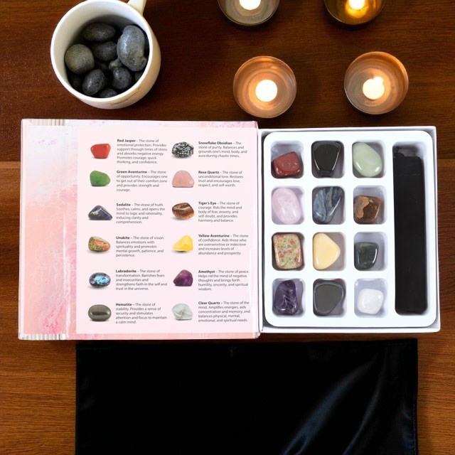 The Little Book of Crystals Set features 12 popular tumblestones—red jasper, snowflake obsidian, green aventurine, rose quartz, sodalite, tiger’s eye, unakite, yellow aventurine, labradorite, amethyst, hematite, and clear quartz—known for balancing chakras and promoting positivity. Complete with a handy drawstring bag