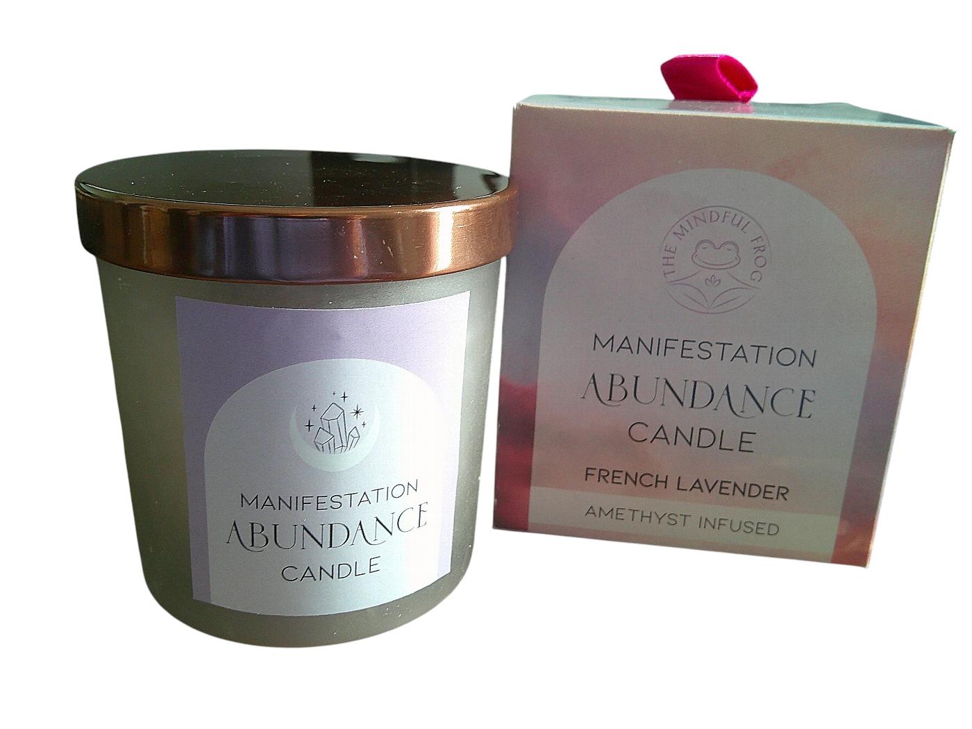 Abundance Manifestation Candle – Lavender-scented and infused with amethyst crystals, this candle promotes relaxation, spiritual alignment, and the attraction of prosperity and abundance. Burn time up to 25hrs